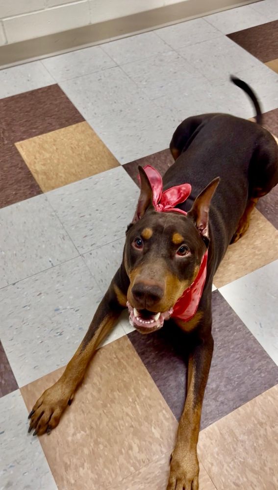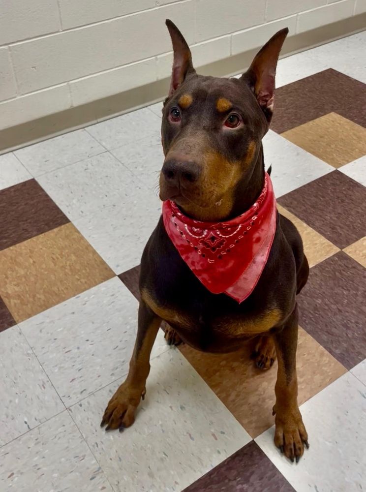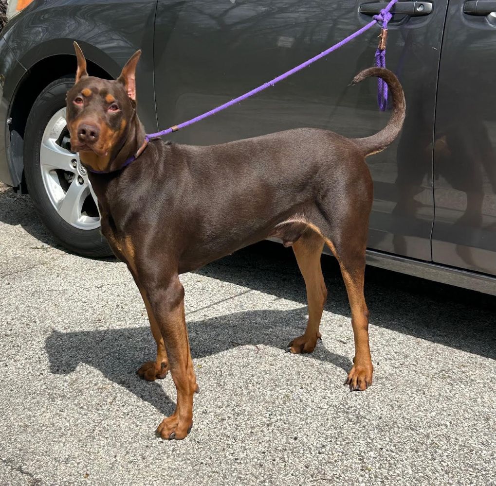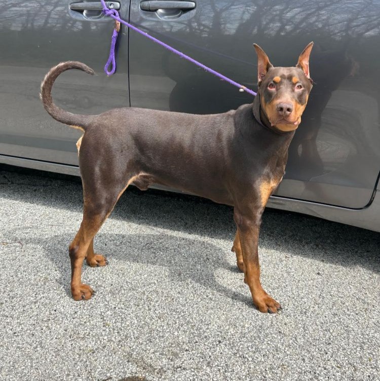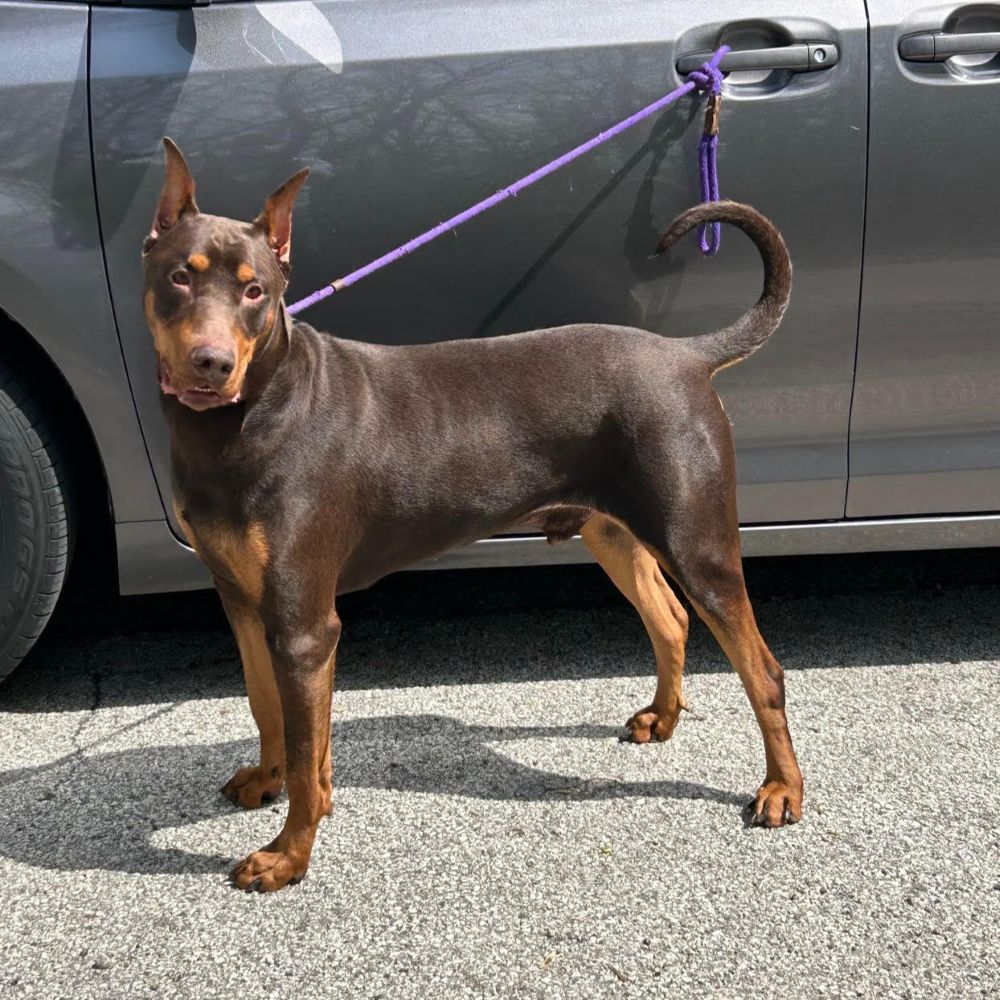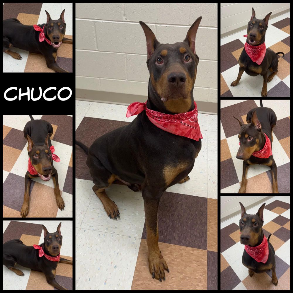 Meet Chuco – our 3-year-old red male Doberman with cropped ears and a natural tail! He’s quite a sight to be seen but adorable nonetheless. He was surrendered to animal control by his owner when they decided they didn’t have time for him and also were supposedly allergic to him. He is reportedly good with children and seems dog social. We always recommend slow introductions when introducing dogs. Don’t miss out on this handsome boy – apply to adopt today!