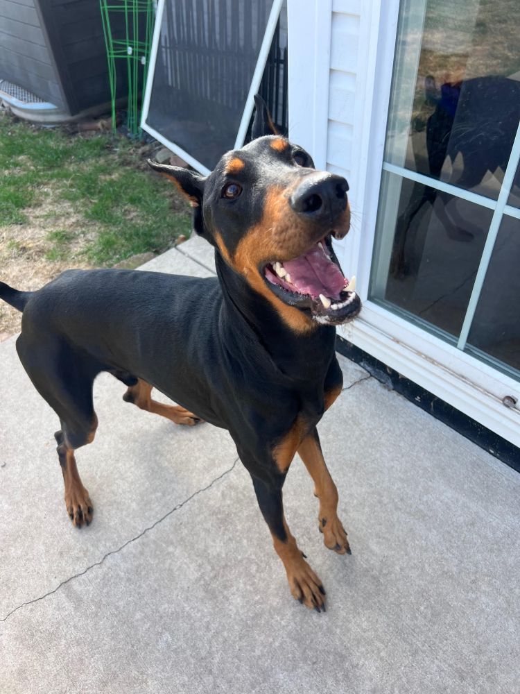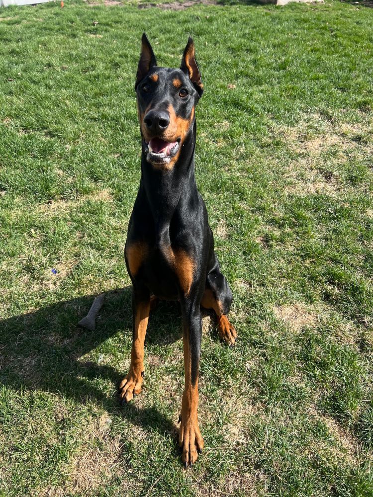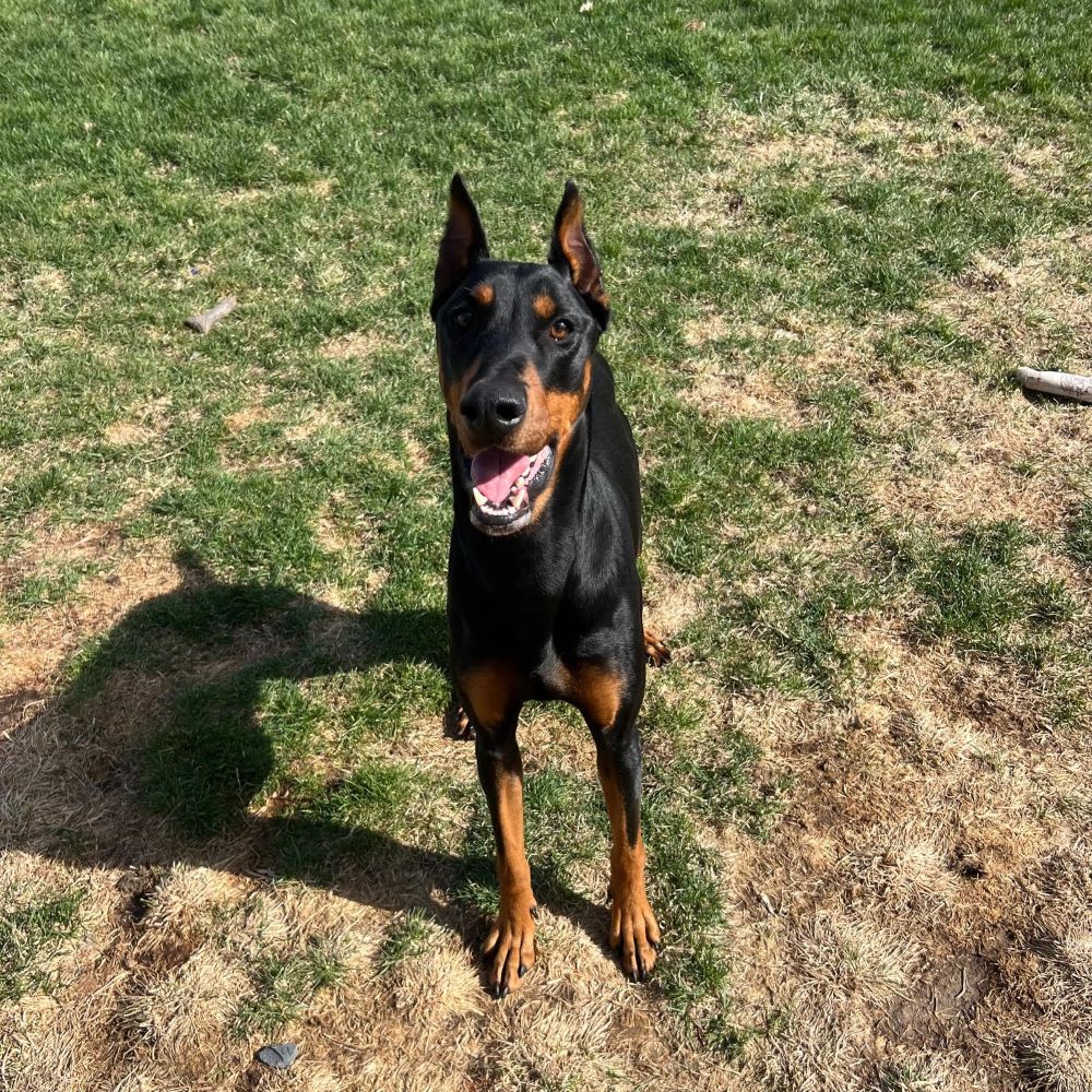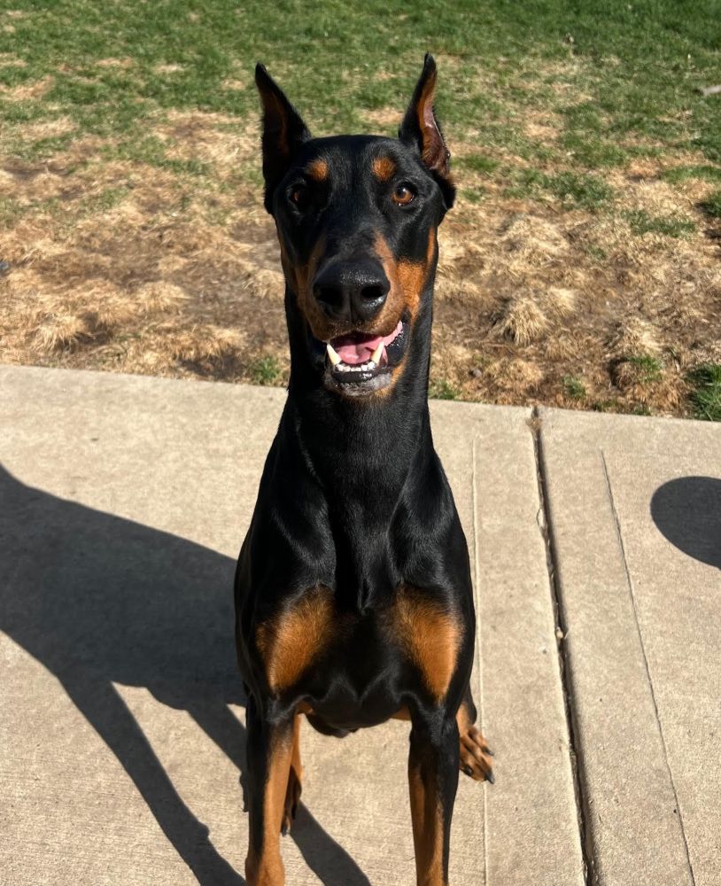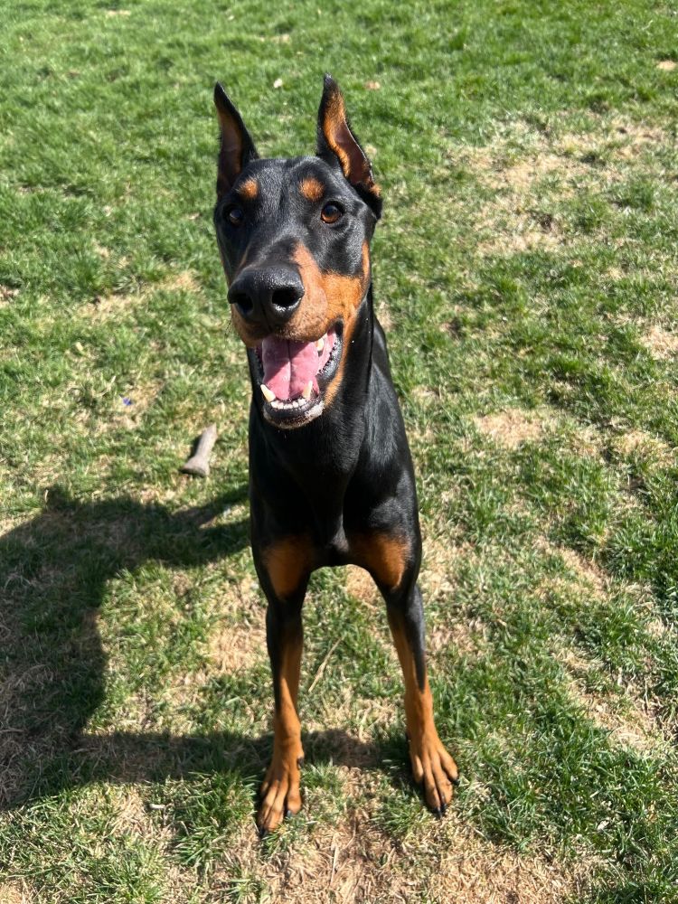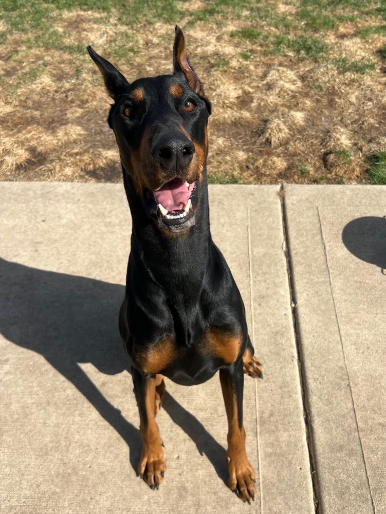 Meet Rocks! He’s a 2-year-old male Doberman who came to us after being found wandering stray with the Chicago suburbs. This friendly boy is quite exuberant and has a true zest for life. He’s a strong one and pulls very hard on the leash and needs to learn some manners but since he’s a Doberman that will come quickly and he’s eager to please. He knows the sit command already. A fence yard is required for exercise – leash walking alone won’t cut it for this energetic boy. He seems to want to play with the other dogs he’s met. He has not been cat tested. Children in the home should be older – maybe 12 and up since he’s a strong and energetic youngster himself. He’s incredibly handsome and charming but will need a Doberman or working dog savvy owner to help him develop into the good boy we know he can be.