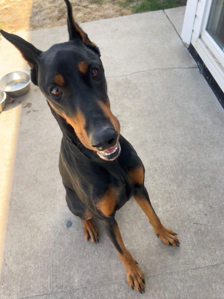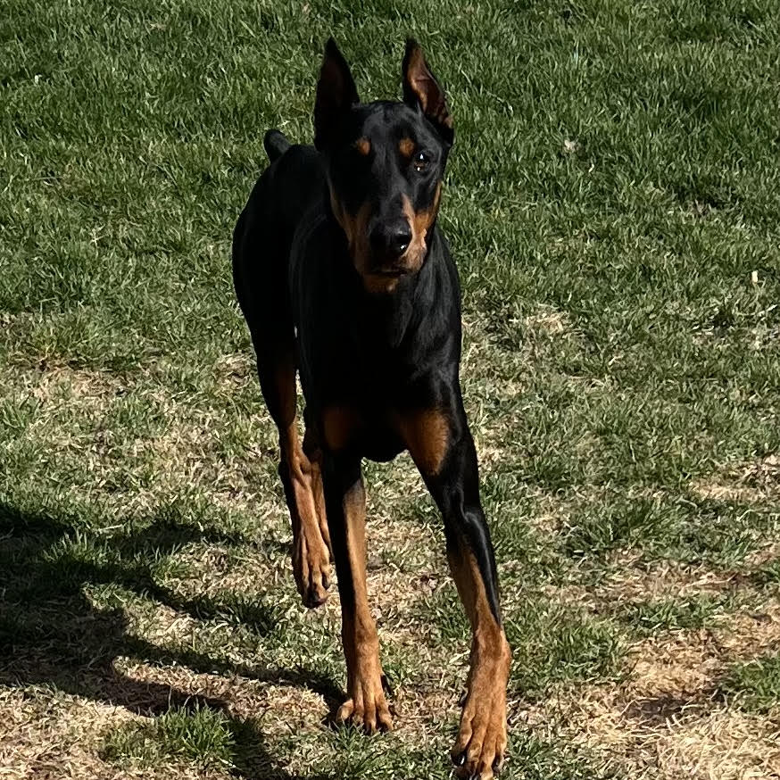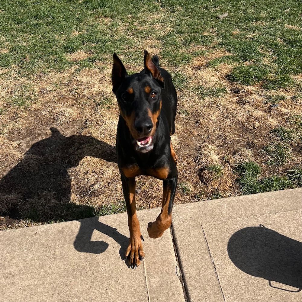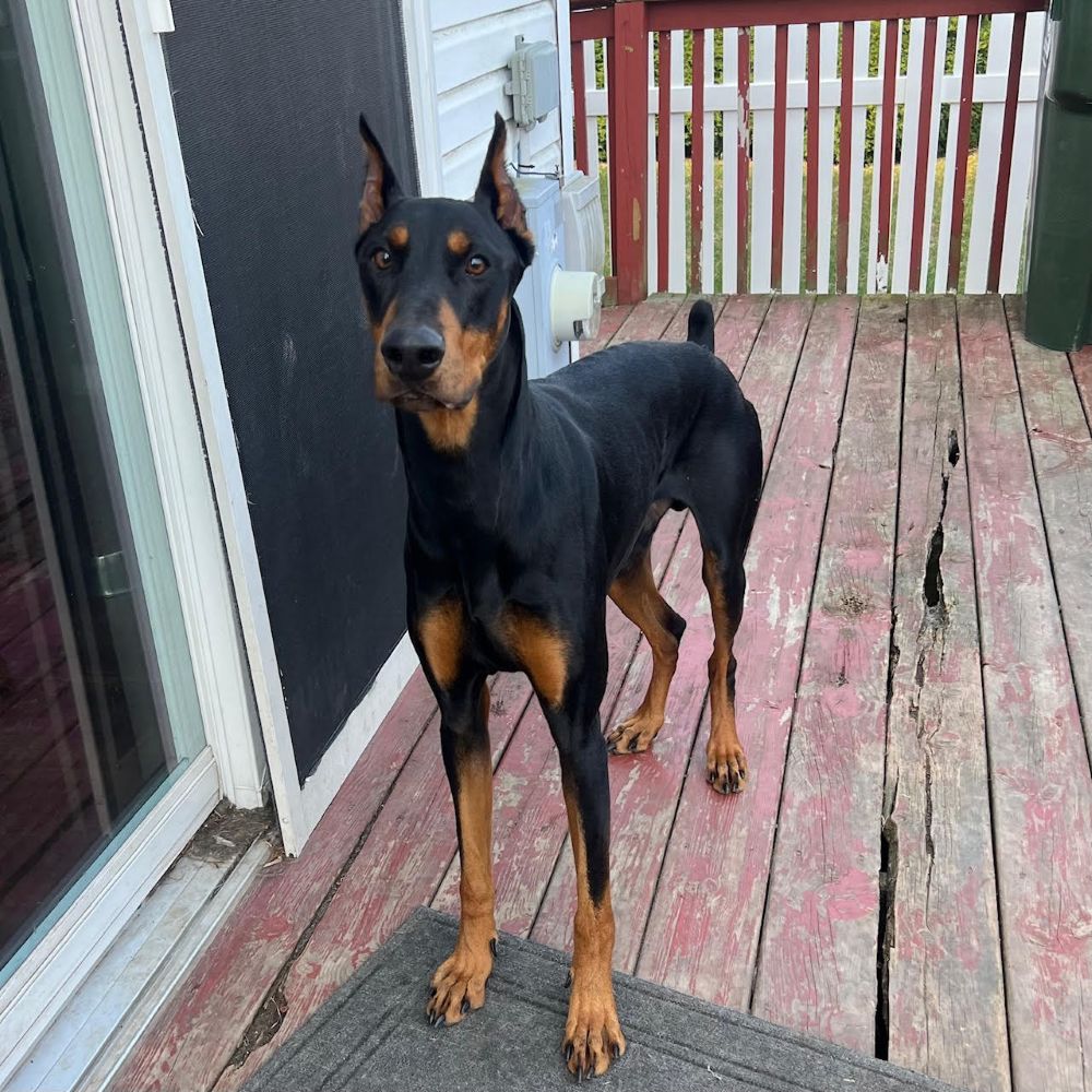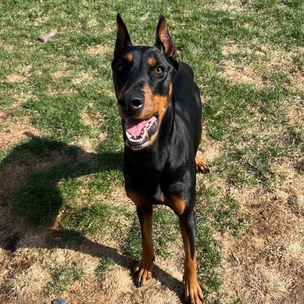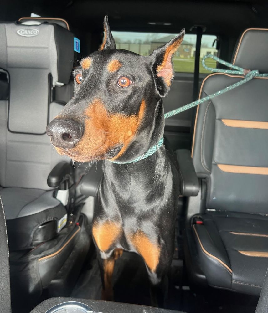 Meet Rocks! He’s a 2-year-old male Doberman who came to us after being found wandering stray with the Chicago suburbs. This friendly boy is quite exuberant and has a true zest for life. He’s a strong one and pulls very hard on the leash and needs to learn some manners but since he’s a Doberman that will come quickly and he’s eager to please. He knows the sit command already. A fence yard is required for exercise – leash walking alone won’t cut it for this energetic boy. He seems to want to play with the other dogs he’s met. He has not been cat tested. Children in the home should be older – maybe 12 and up since he’s a strong and energetic youngster himself. He’s incredibly handsome and charming but will need a Doberman or working dog savvy owner to help him develop into the good boy we know he can be.
