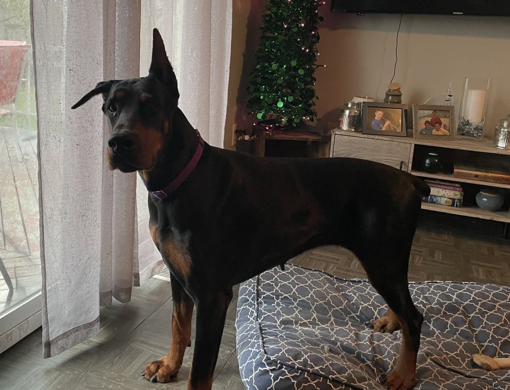 She’s mostly housebroken if kept on a consistent schedule and let out frequently, but nighttime is still a challenge. If crated overnight, she’ll whine, dig, and fuss; if left loose, she may still have accidents even after going outside. She’s also a bit of a nibbler — blankets, pillows, rugs, and stuffed items aren’t safe with Zara.