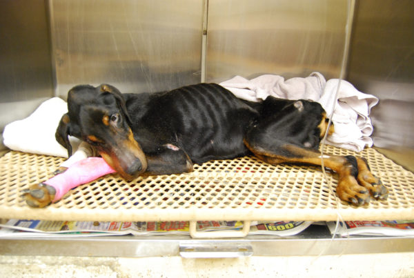 In January 2011, we received an urgent call from animal control about a severely emaciated Doberman literally left in the trash in an alley. He was 33 pounds, and his body temperature was so low, it didn’t register on a thermometer. The vets were worried he would not survive the first night, but he soon started to turn around! We named him Miracle after he started to have a miraculous recovery. After several months of TLC, Miracle transformed into a fully healthy 90-pound dog who loves his life with his family. Miracle received many generous donations when he came in for his care, and his family wants to encourage everyone to continue donating to IDR+ for other dogs like him.